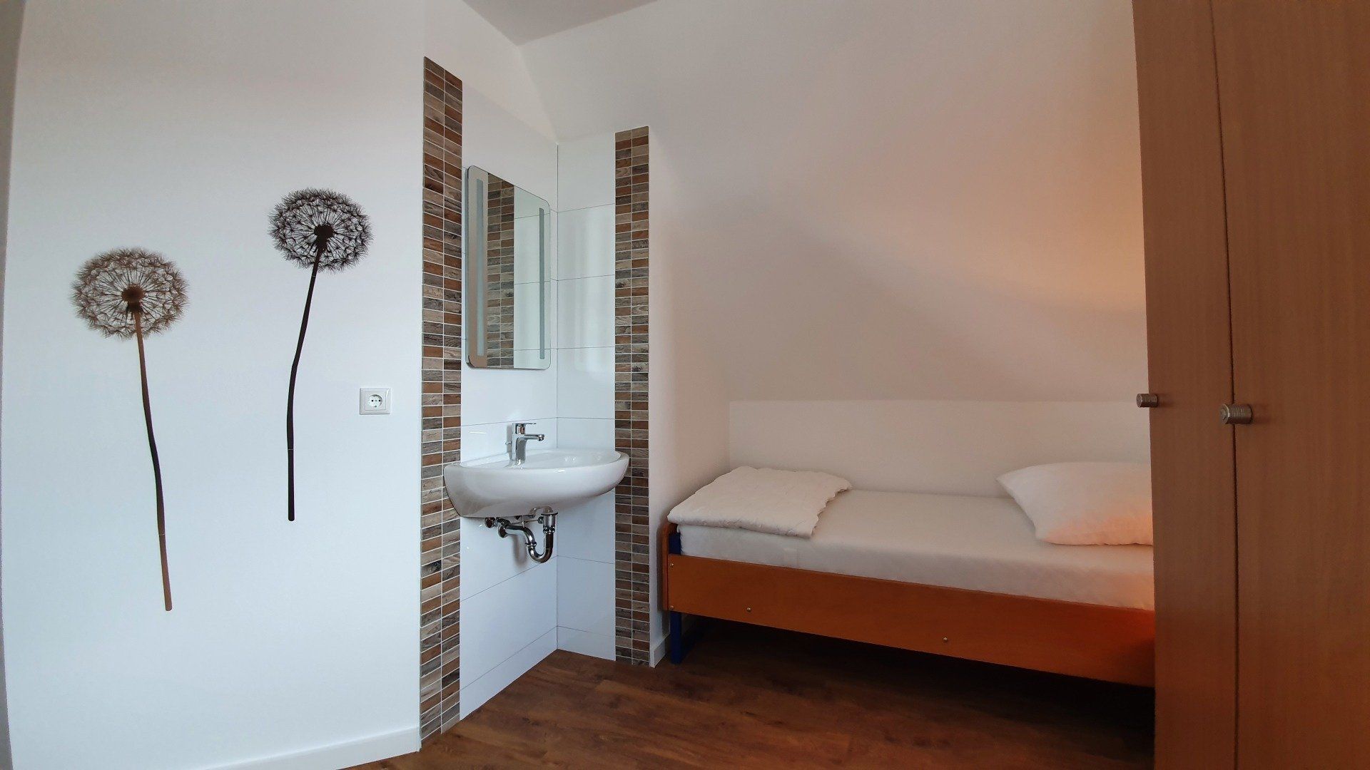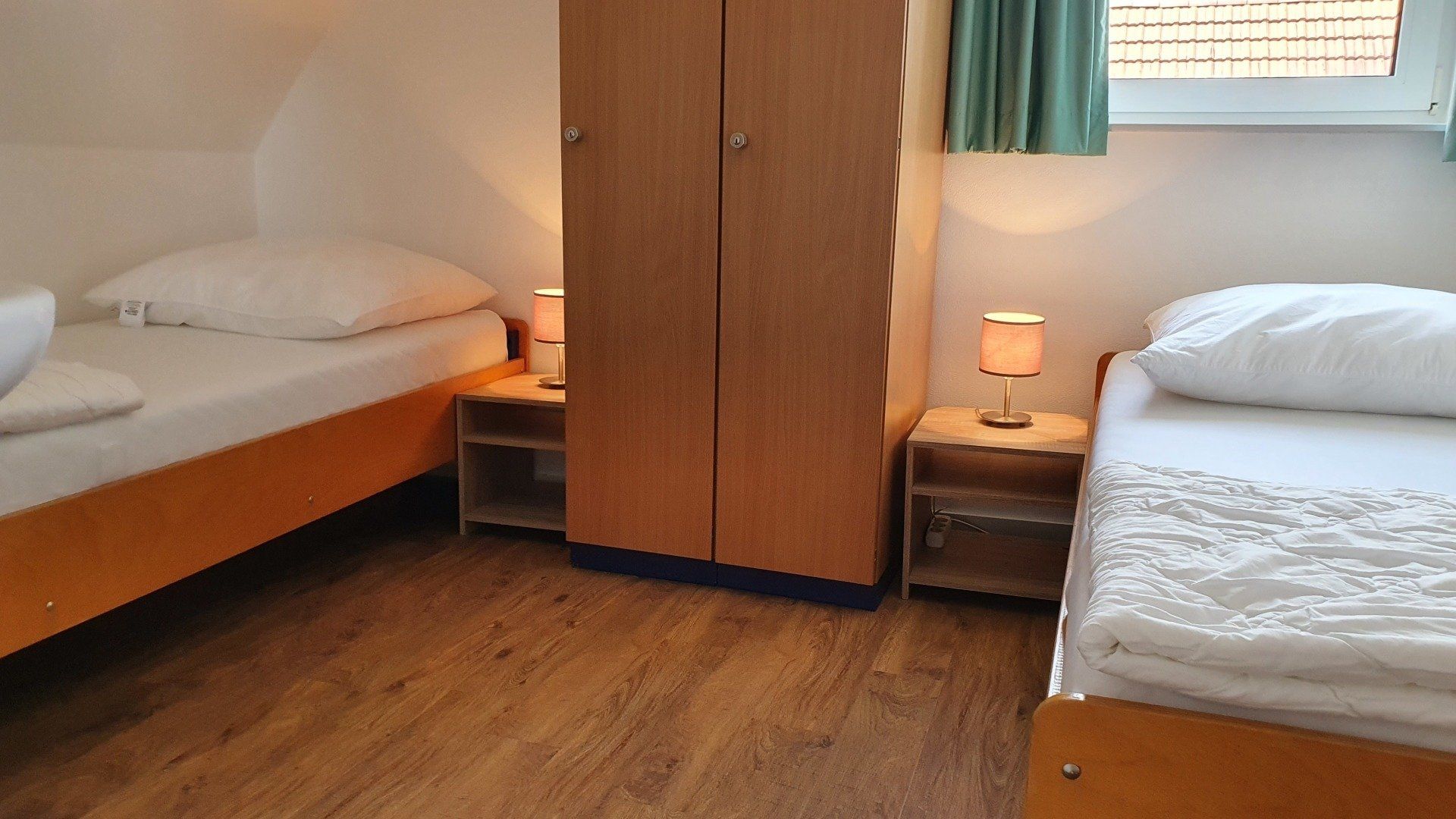Im Obergeschoss befinden sich zwei 4-Bett-Zimmer, welche mit komfortablen Einzelbetten,